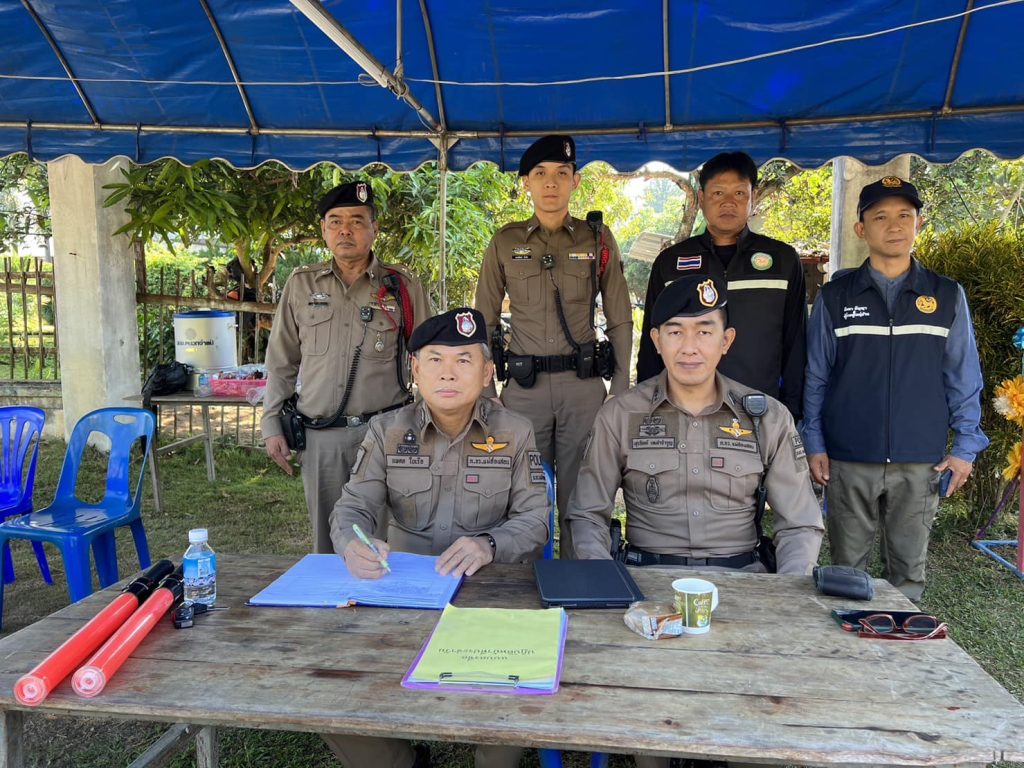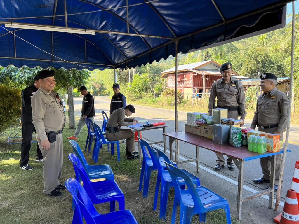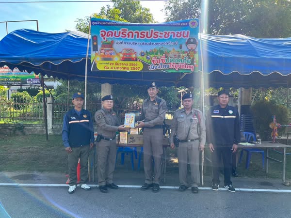 พ.ต.อ.นพดล ใบเรือ รอง ผบก. ภ.จว.แม่ฮ่องสอน ได้มาตรวจเยี่ยมจุดบริการประชาชน องค์การบริหารส่วนตำบลหมอกจำแป่ อำเภอเมืองแม่ฮ่องสอน จังหวัดแม่ฮ่องสอน พบ พ.ต.ท.สุรจิตต์ เหล่าจำรูญ สว.สภ.หมอกจำแป่ พร้อมด้วย รองสว.(สส.)สภ.หมอกจำแป่ และเจ้าหน้าที่ตำรวจประจำจุดตรวจ และเจ้าหน้าที่ฝ่ายปกครอง ร่วมปฏิบัติหน้าที่ ให้เจ้าหน้าที่ปฏิบัติหน้าที่ตามกฎหมาย เพิ่มความเข้มการบังคับใช้กฎหมาย เพื่อลดอุบัติเหตุทางถนน ตามมาตรการ 10 ข้อหาหลัก โดยเฉพาะข้อหาขับรถในขณะเมาสุรา ขับรถเร็วเกินกำหนด ไม่สวมหมวกนิรภัย ไม่รัดเข็มขัดนิรภัย และขับรถย้อนศร และได้มอบอาหาร เครื่องดื่ม สิ่งของที่จำเป็นให้กับเจ้าหน้าที่ตำรวจประจำจุดตรวจ เพื่อเป็นขวัญกำลังใจในการปฏิบัติหน้าที่ช่วงเทศกาลปีใหม่ 2567
