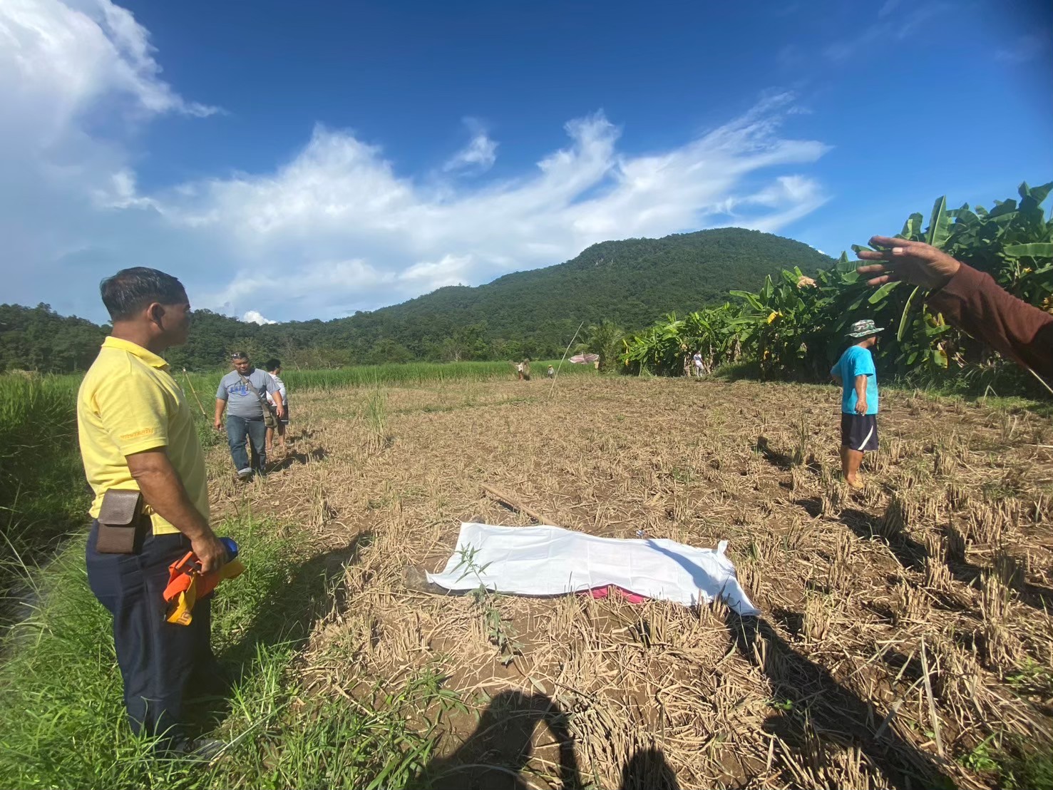 พนักงานสอบสวนเวรและแพทย์เวรโรงพยายบาลศรีสังวาลย์ ตรวจสอบที่เกิดเหตุกลางทุ่งนาบ้านแม่สะงา