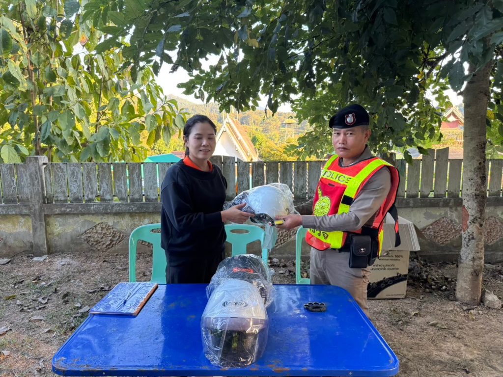 พ.ต.ท.สุรจิตต์ เหล่าจำรูณ สว.สภ.หมอกจำแป่ พร้อมด้วยข้าราชการตำรวจ สภ.หมอกจำแป่ ตั้งจุดบริการประชาชน มอบหมวกกันน็อค ในวันปีใหม่ พ.ศ.2568 ขับขี่ปลอดภัย ในพื้นที่ วัดบ้านแม่สะงา หมู่ที่ 2 ต.หมอกจำแป่ อ.เมือง จ.แม่ฮ่องสอน